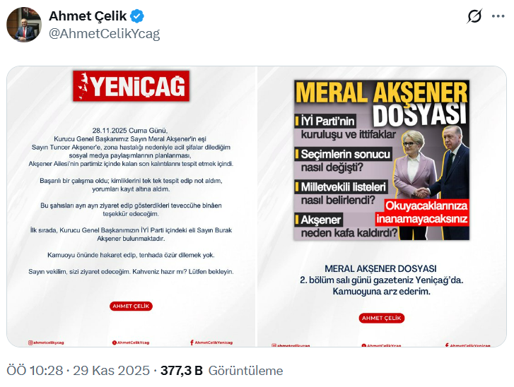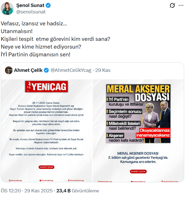 Çelik, Meral Akşener’in eşi Tuncer Akşener’in zona hastalığı nedeniyle geçmiş olsun dileklerini paylaşırken, aynı zamanda “Akşener ailesinin partide kalan son kalıntılarını tespit etmek için çalışma yaptığını” öne sürdü.