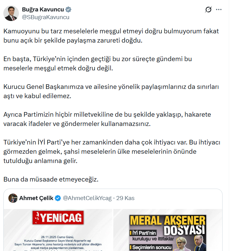 İYİ Parti İstanbul Milletvekili Buğra Kavuncu: “Kamuoyunu bu tarz meselelerle meşgul etmeyi doğru bulmuyorum fakat bunu açık bir şekilde paylaşma zarureti doğdu. En başta, Türkiye’nin içinden geçtiği bu zor süreçte gündemi bu meselelerle meşgul etmek doğru değil. Kurucu Genel Başkanımıza ve ailesine yönelik paylaşımlarınız da sınırları aştı ve kabul edilemez. Ayrıca Partimizin hiçbir milletvekiline de bu şekilde yaklaşıp, hakarete varacak ifadeler ve göndermeler kullanamazsınız. Türkiye’nin İYİ Parti’ye her zamankinden daha çok ihtiyacı var. Bu ihtiyacı görmezden gelmek, şahsi meselelerin ülke meselelerinin önünde tutulduğu anlamına gelir. Buna da müsaade etmeyeceğiz.”