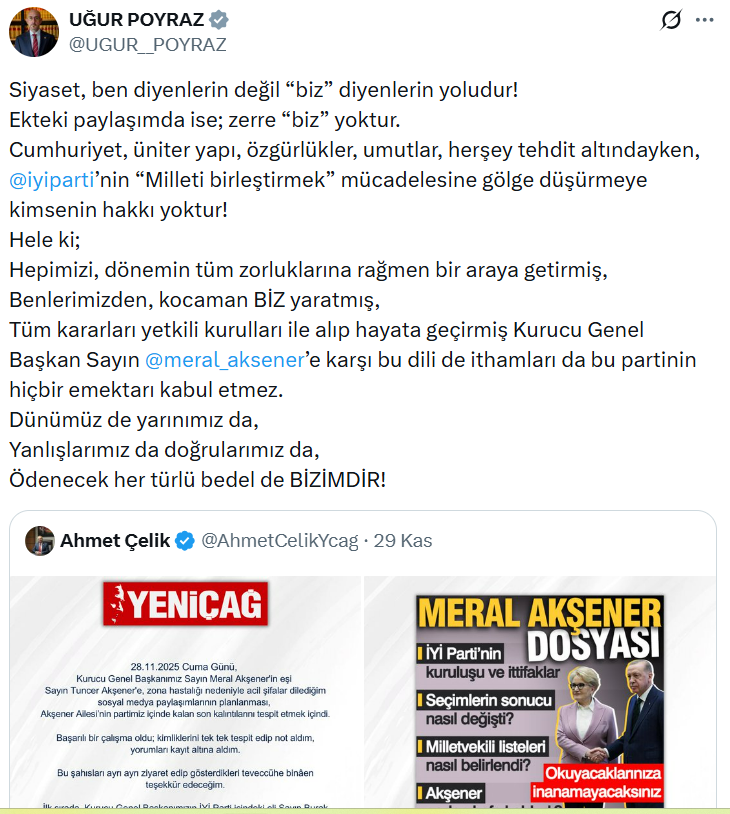İYİ Parti Genel Sekreteri Uğur Poyraz: “Siyaset, ben diyenlerin değil ‘biz’ diyenlerin yoludur! Ekteki paylaşımda ise; zerre ‘biz’ yoktur. Cumhuriyet, üniter yapı, özgürlükler, umutlar, herşey tehdit altındayken, İYİ Parti’nin ‘Milleti birleştirmek’ mücadelesine gölge düşürmeye kimsenin hakkı yoktur! Hele ki; hepimizi, dönemin tüm zorluklarına rağmen bir araya getirmiş, benlerimizden, kocaman BİZ yaratmış, Tüm kararları yetkili kurulları ile alıp hayata geçirmiş Kurucu Genel Başkan Sayın Meral Akşener’e karşı bu dili de ithamları da bu partinin hiçbir emektarı kabul etmez. Dünümüz de yarınımız da, Yanlışlarımız da doğrularımız da, Ödenecek her türlü bedel de bizimdir!”