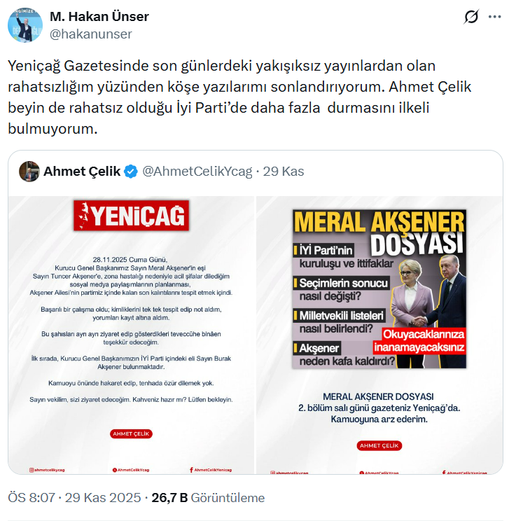 Öte yandan, Yeniçağ gazetesi köşe yazarı Mustafa Hakan Ünser ise Çelik’in paylaşımının ardından gazetedeki köşe yazılarını, yaptığı şu paylaşımla noktaladığını duyurdu: