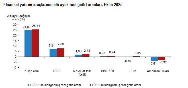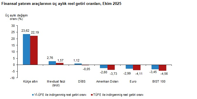 Türkiye İstatistik Kurumu (TÜİK) ekim ayının en çok kazandıranlarını açıkladı. Buna göre aylık en yüksek reel getiri, yurt içi üretici fiyat endeksi (Yİ-ÜFE) ile indirgendiğinde yüzde 13,63, tüketici fiyat endeksi (TÜFE) ile indirgendiğinde ise yüzde 12,61 oranlarıyla külçe altında gerçekleşti.