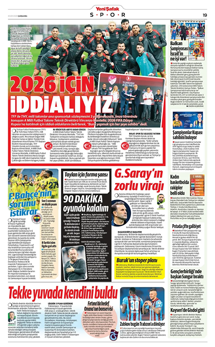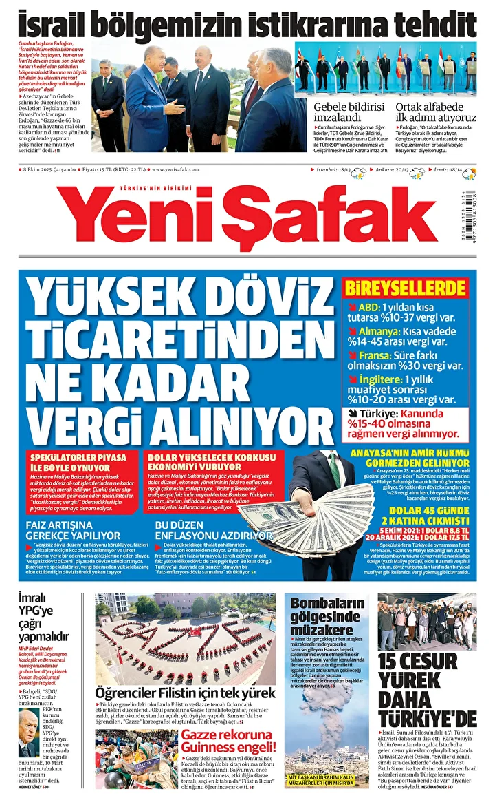 Yeni Şafak Gazetesi’nin 08 Ekim 2025 tarihli birinci sayfasında yer alan manşet ve haberler…