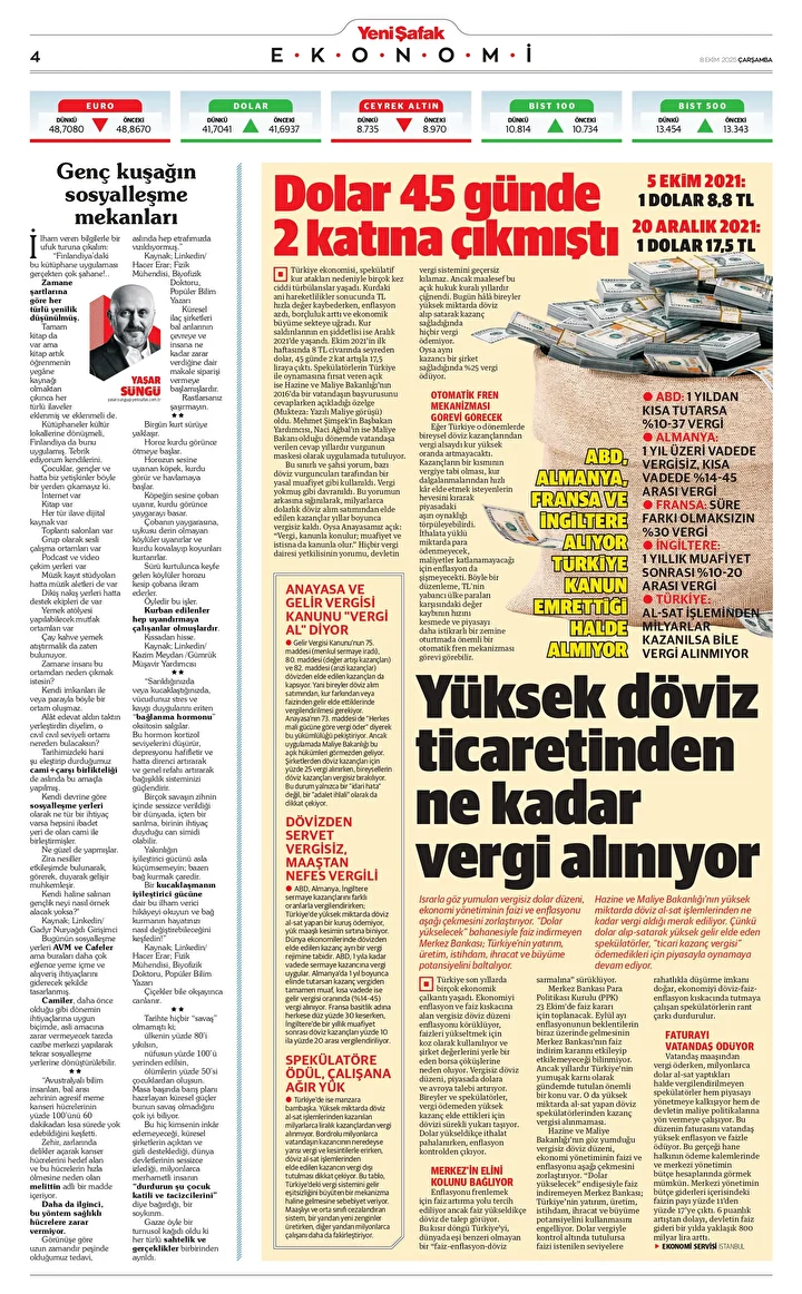 Israrla göz yumulan vergisiz dolar düzeni, ekonomi yönetiminin faizi ve enflasyonu aşağı çekmesini zorlaştırıyor. “Dolar yükselecek” bahanesiyle faiz indirmeyen Merkez Bankası; Türkiye’nin yatırım, üretim, istihdam, ihracat ve büyüme potansiyelini baltalıyor. Hazine ve Maliye Bakanlığı’nın yüksek miktarda döviz al-sat işlemlerinden ne kadar vergi aldığı merak ediliyor. Çünkü dolar alıp-satarak yüksek gelir elde eden spekülatörler, “ticari kazanç vergisi” ödemedikleri için piyasayla oynamaya devam ediyor.